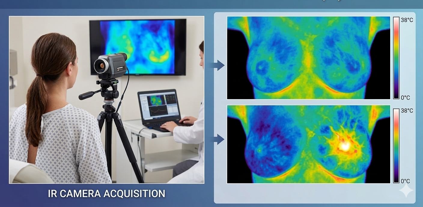 CNN-SVM model analyzes infrared breast images to detect cancer early, improving diagnostic accuracy using features extracted from grayscale IR datasets.